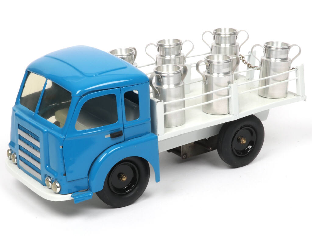 longueur : 31,5 cm - avec moteur à clef (fonctionne), direction, portières ouvrantes & 6 pots à lait en aluminium - RESTAURATION DE QUALITE PROFESSIONNELLE !