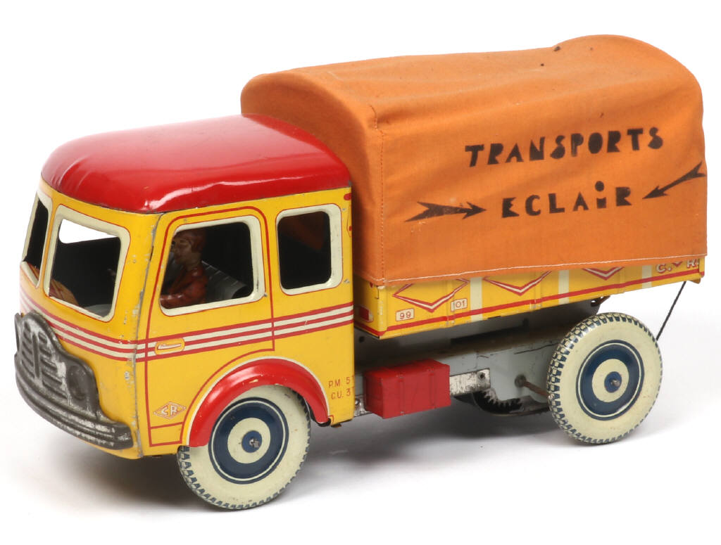C.R. (FRANCE) 4003 Camion bâché 'TRANSPORTS ECLAIR' en tôle lithographiée jaune, rouge & orange