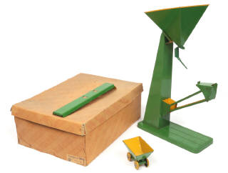 dimensions du coffret : 36 x 27 cm (décoloré, taché & déformé) - contient : une trémie, wagonnet (manques de peinture sur une roue) & une rampe (manque pelle & tamis) - ensemble légèrement poussiéreux