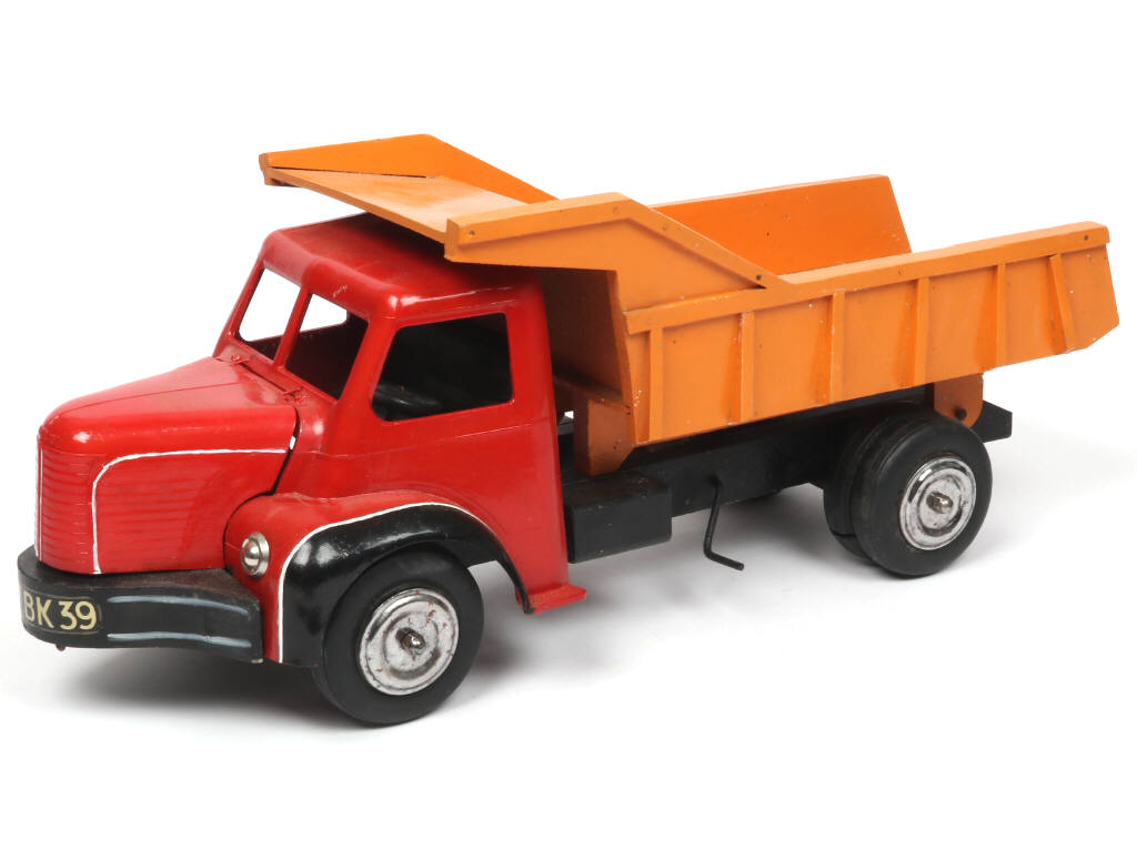 longueur : 52 cm - jouet à traîner - réalisation en bois & plastique - avec benne basculante fonctionnelle & capot-moteur ouvrant - certains éléments non repeints - très légères traces d'oxydation par endroits