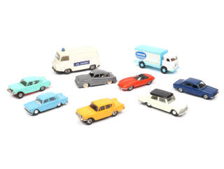 certaines carrosseries légèrement encrassées & avec déformations - quelques déformations - un pare-chocs avec une fixation à recoller - on y joint 2 modèles FIAT de la marque KDN & un camion PEGASO fourgon 'DANONE' de marque indéterminée (sans volant)