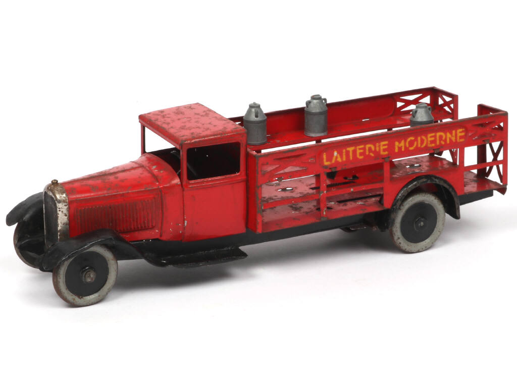 longueur : 30 cm - avec moteur à clef (à revoir) & direction - restaurations plus ou moins importantes avec parties repeintes & éléments non d'origine (notamment les ailes avant) - traces d'oxydation - partie rouge non retouchée ni restaurée - on y joint 3 pots à lait non d'origine