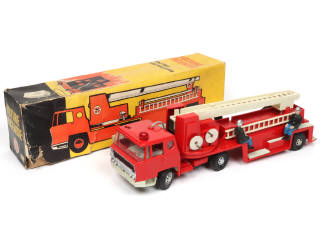 longueur : 48 cm - avec moteur à piles (à revoir, traces d'oxydation à l'intérieur du boîtier de commande avec lamelle incomplète), direction (à revoir), 4 pompiers & une échelle amovible - quelques accessoires manquants dont certaines fixations cassées - manques de carton sur une extrémité de couvercle de boîte
