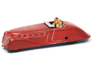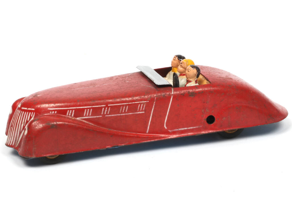 longueur : 23 cm - version de 1937 avec moteur à clef (à revoir), 3 personnages & sans logo - pare-brise repeint - bloc moteur oxydé
