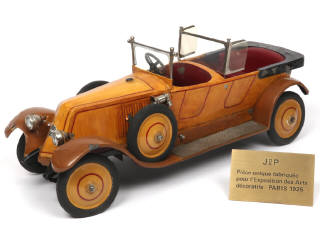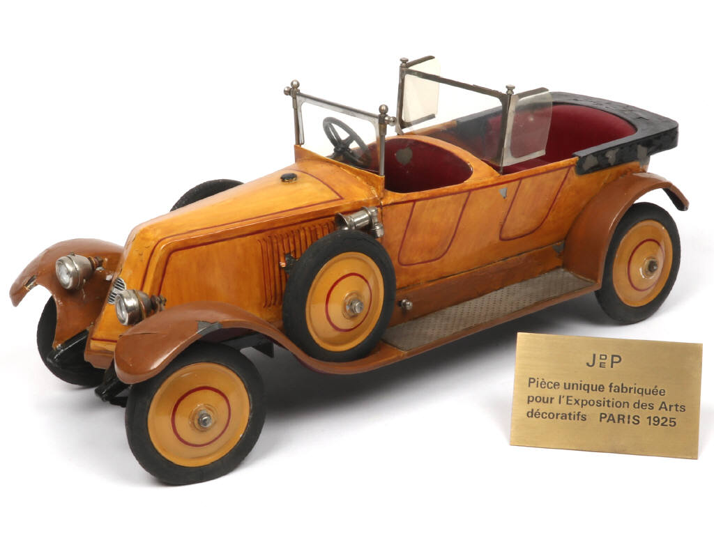 longueur : 44 cm - avec moteur à clef, phares électriques (ensemble non testé) & direction - importantes craquelures de peinture par endroits avec manques majeurs (dus à l'humidité) - pneus séchés & craquelés - 3 extrémités d'ailes déformées - pièce unique réalisée (carrosserie peinte & décorée à la main) pour l'exposition des Arts décoratifs de 1925 (avec plaque de présentation, récente) - HISTORIQUE !