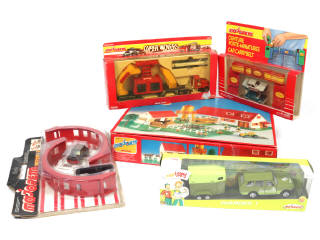MAJORETTE (FRANCE) Ensemble de 5 véhicules, une remorque & des éléments de bâtiments