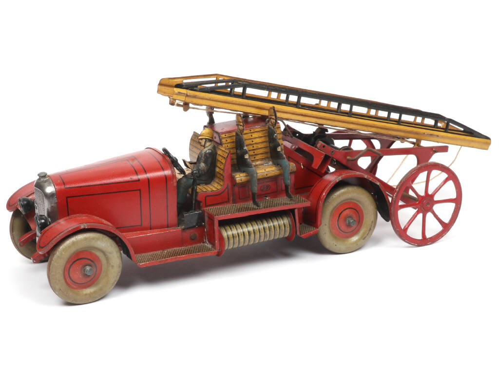 fabriqué de 1931 à 1937 - longueur : 43 cm - avec moteur à clef (fonctionne), direction, frein & 5 pompiers - quelques traces d'oxydation par endroits - légères restaurations & quelques manques (notamment un pompier)