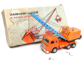 longueur : 47 cm - avec moteur à clef (à revoir), mécanismes de grue (fonctionnent), clef, manivelle & portière conducteur ouvrante (manque conducteur) - bandeau de cabine & phares ternis (une petite trace d'oxydation sur une jante) - boîte restaurée (avec 3 cales)