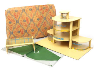 dimensions 43 x 24,5 x 29 cm & 21 x 18 x 9,5 cm - comprend : une tour de contrôle (manque radars), tapis de piste d'envol (très légèrement taché par endroits) & hangar à avions - inscriptions sur les éléments plastiques plus ou moins altérées - quelques frottements par endroits - ensemble légèrement encrassé - boîte incomplète