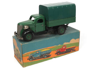 longueur : 34 cm - avec moteur à clef (à revoir), direction, portières ouvrantes & conducteur - version sans phare électrique - quelques rayures sur le toit - pare-choc avant & calandre ternis - un petit enfoncement sur la ridelle arrière - boîte légèrement jaunie avec petites taches