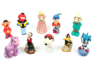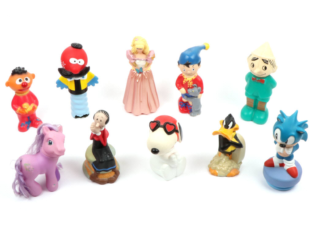 bouteilles de shampoing à l'effigie des héros de dessins animés (vides) - on y retrouve notamment SONIC, OUI OUI, SNOOPY, ZEBULON (socle cassé) & BARBIE - ensemble encrassé