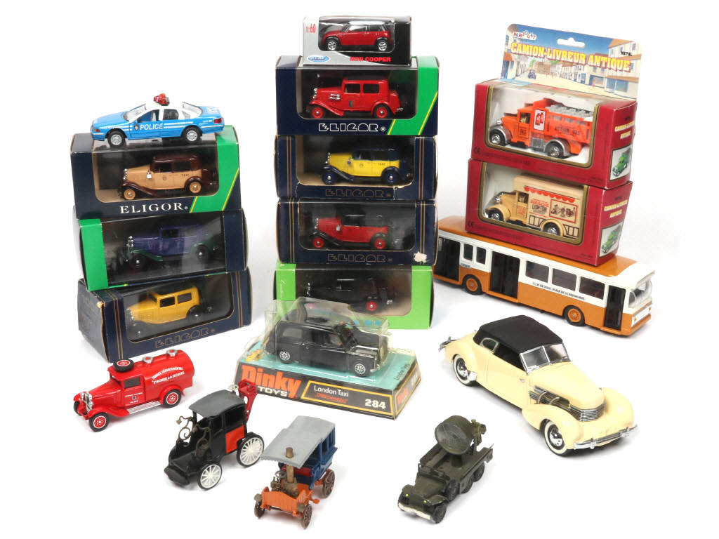 on y retrouve notamment les marques : FRANCE JOUETS, FRANKLIN MINT, DINKY TOYS GB, ELIGOR & MINIALUXE - quelques manques & éléments cassés sur 2 exemplaires - 11 modèles avec boîtes (états 'b' & 'c')