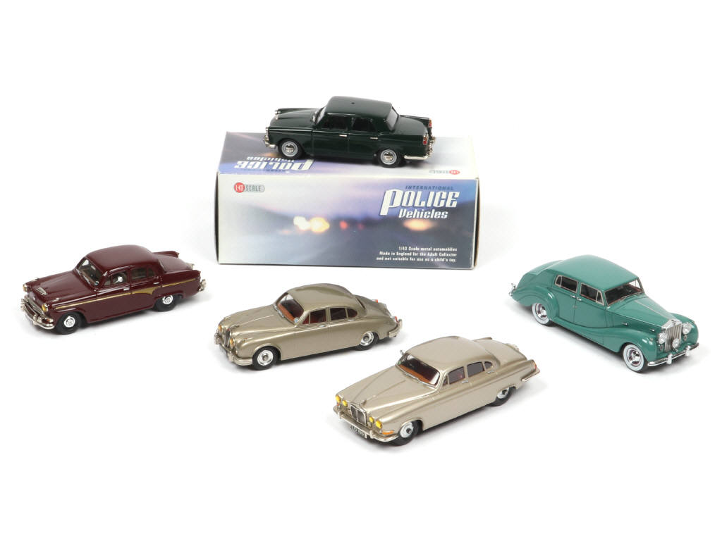 comprend les modèles : AUSTIN (manque antenne) & JAGUAR - on y retrouve notamment les marques : INTERNATIONAL POLICE VEHICLES, GRAND PRIX MODELS & GEMS & COBWEBS - petits détails ajoutés - possibilité de petits accessoires manquants