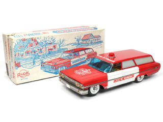 longueur : 48 cm - avec moteur à piles, bruiteur (fonctionnent) & gyrophare électrique (à revoir) - cales de boîte présentes