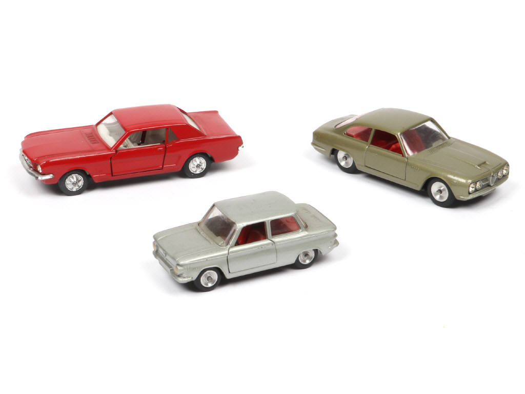 comprend : FORD MUSTANG, ALFA ROMEO 2600 (version avec aménagement intérieur rouge, plancher noir & phares translucides - COULEUR RARE !) & NSU PRINZ IV