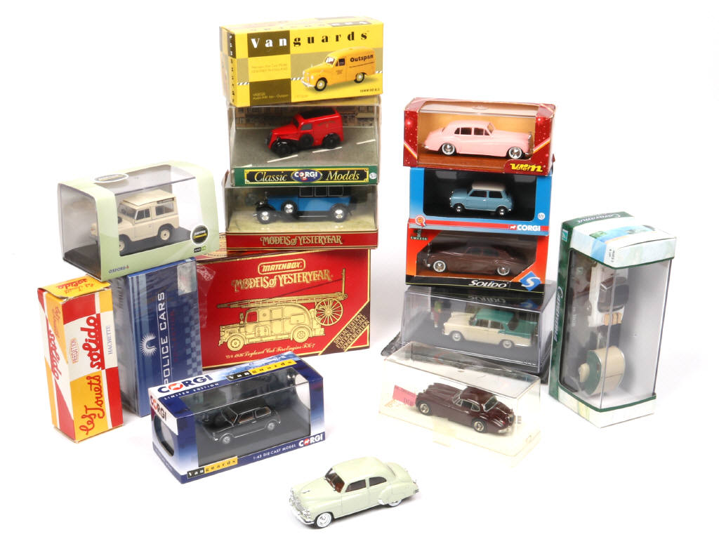 comprend notamment les modèles : JAGUAR (kit métal - boite SOLIDO non conforme), SIMCA, ROLLS ROYCE, AUSTIN & CHEVROLET - on y retrouve les marques : SPIELWAREN DANHAUSEN, VEREM, SOLIDO, OXFORD, CORGI & CARARAMA - 2 boites en état 'c'