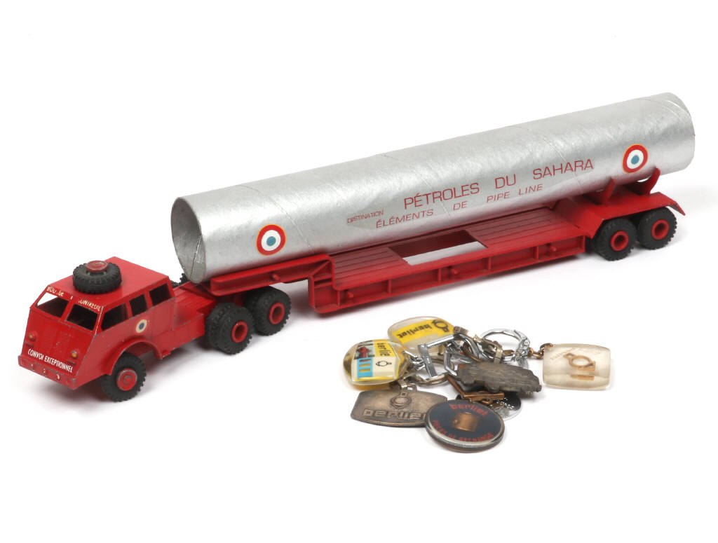 un décalque de cabine & un autre de pile incomplets - on y joint 7 porte-clefs (états de 'a' à 'c', 2 exemplaires ternis, on y retrouve notamment la marque BOURBON)