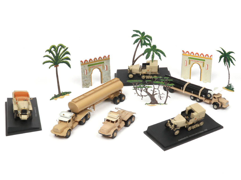 3 exemplaires vendus en kiosque (CITROËN autochenilles) 3 autres montés & peints - on y joint 6 éléments de décors de la marque C.B.G - quelques petits éléments décollés & d'autres manquants