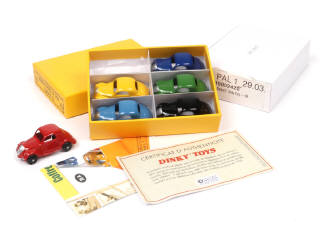 contient : 6 SIMCA 5 (3 avec roues noires & 3 avec roues blanches), certificat d'authenticité, cales de boite, dépliant présentant le coffret & surboite