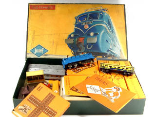 contient : une motrice électrique BB-9004, 2 voitures de voyageurs de 2ème classe, 2 wagons-citernes, une voiture Pullman en tôle lithographiée, un poste d'aiguillage & un transformateur de type 480 - on y joint 10 boîtes de rails divers & un catalogue de la marque