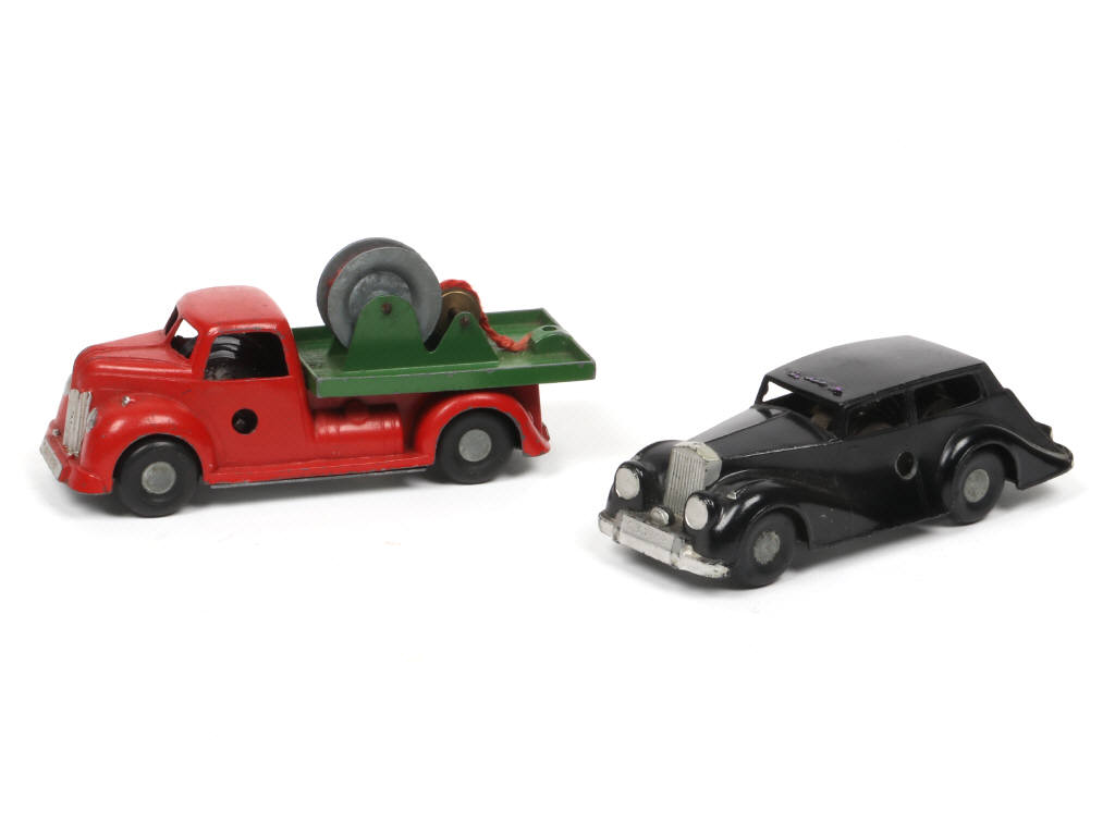 moteurs à clef (fonctionnels) - comprend : COMMER camion-plateau avec dérouleur de câble (lest manquant) & ROLLS ROYCE 'POLICE' (pannonceau à recoller - traces de colle sur le toit) - certains pneus séchés