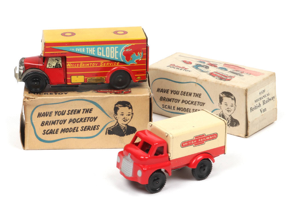 moteur à friction fonctionne - longueur 11cm - quelques éléments ternis (boite d'origine BRIMTOY - référence 540 - manque 2 rabats) - on y joint un BRITISH RAILWAY van de la marque BRIMTOY (référence 540 - boite en état 'b' avec petites taches)