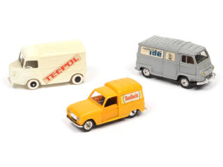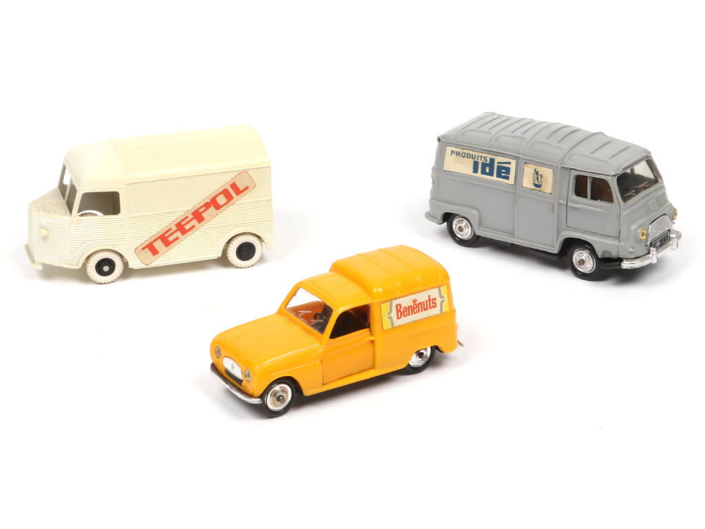 modèles encrassés - comprend les modèles : ESTAFETTE & R4 (publicités vraisemblablement non d'origine) - une carrosserie avec déformations & publicités gondolées - on y joint un CITROEN 1200 kg 'TEEPOL' (une publicité légèrement décollée) de la marque CLE