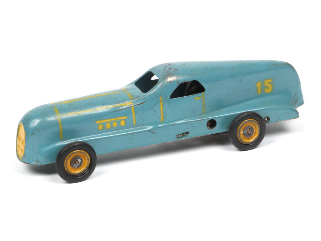 n°15 - longueur 18 cm - moteur à clef (à revoir - avec petits manques) - traces d'oxydation sur le bloc-moteur & les axes de roues (pneus non d'origine)