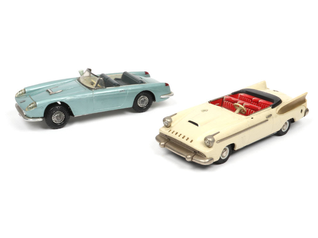 longueur 28 cm - fabrications en plastique & métal - comprend : FERRARI 410 SUPERAMERICA (moteur à pile fonctionnel) & PACKARD SYNCHROMATIC (moteur à piles à revoir - oxydation par endroits) - on y retrouve les marques : SCHUCO & MONT BLANC - avec manques & parties cassées