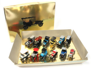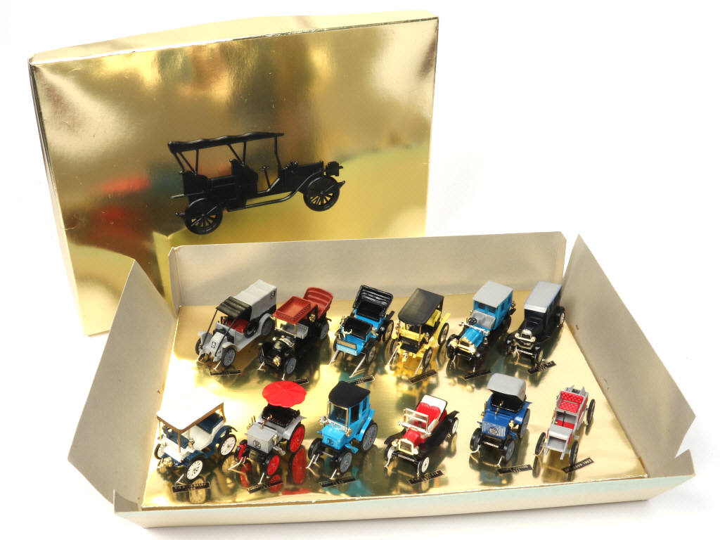 comprend notamment les modèles : CITROËN, RENAULT, FORD & PEUGEOT - modèles présentés sur socle avec élastique de maintien d'origine & étiquettes de désignation pour chaque véhicule - manques quelques petits accessoires sur certains modèles - fond de boîte décoloré (une petite déchirure sur le couvercle, mica déformé)