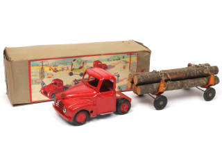 longueur de l'ensemble : 44 cm - avec moteur à clef (fonctionne) & chargement de 5 grumes - parties chromées plus ou moins ternies - manque attelage de remorque & un petit onglet de rabat de boîte - légèrement encrassé