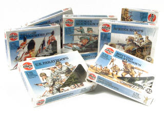 échelle 1/72ème - comprend : 2 boîtes de grenadiers britanniques, 2 boîtes de soldats de l'Afrika Korps, 2 boîtes de parachutistes britanniques, 2 boîtes de chasseurs alpins allemands & 2 boîtes de parachutistes américains - boîtes sous film plastique jamais ouvertes