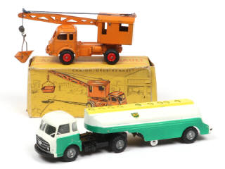 comprend : SAVIEM JM240 semi-remorque citerne 'BP' (version avec petit logo) & RENAULT 120CV camion-grue (jantes plastiques avec pourtours fondus - boite en état 'c') - quelques pneus séchés