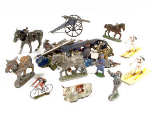états de A' à 'E' - comprend : 16 soldats, 2 cyclistes, un motocycliste, 2 chevaux & une vache - on y joint 2 canons de marque CR dont un incomplet