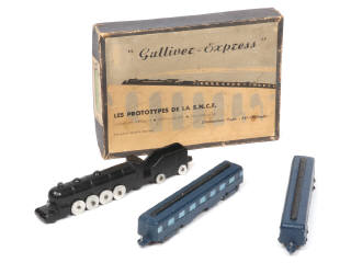 réalisation en aluminium - comprend : une locomotive à vapeur type 141 'MIKADO' avec tender & 2 voitures-voyageurs (état 'C' avec quelques petites traces de colle d'origine par endroits) - traces d'oxydation sur les axes de roues de la locomotive - illustration de boîte jaunie & légèrement tachée (avec cale, restaurations)