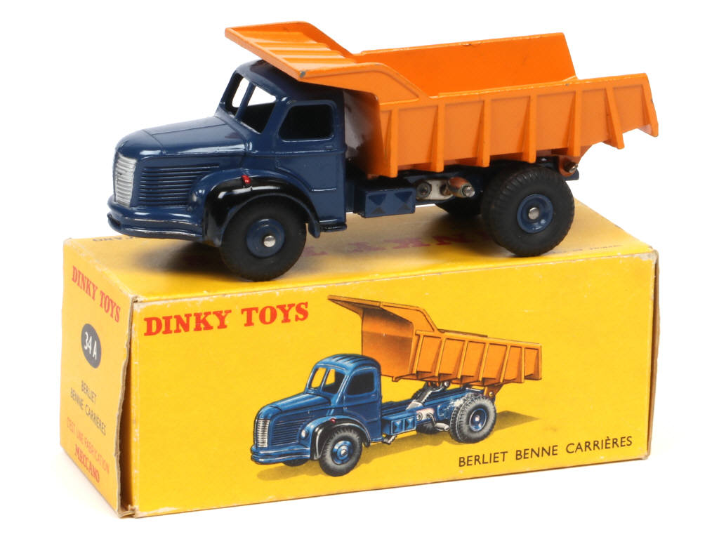 DINKY TOYS (FRANCE) 34A BERLIET Benne carrière MARREL (version avec jantes convexes) bleu foncé & orange