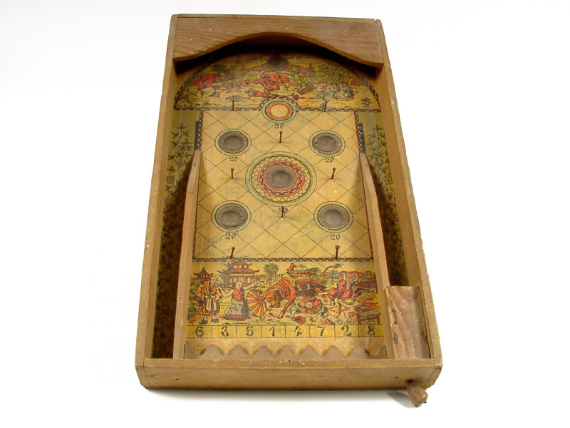 dimensions : 40 x 22,5 x 4,2 cm - piste de jeu en papier collé représentant des scènes chinoises - manque billes & un petit élément - traces d'oxydation sur les partie métalliques - tirette de lancement de bille légèrement tordue - petites annotations au crayon de papier sur le dessous - ancêtre du flipper moderne