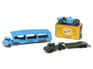 comprend : BEDFORD CAR TRANSPORTER (version avec roues métal), BUGATTI type 55 (boite en état 'C') & THORNYCROFT tank transporter (série 'MAJOR PACK')