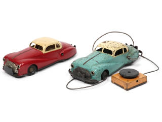 longueur : 22 cm - avec moteurs à clef (fonctionnent, avec une clef) & directions - un exemplaire téléguidé (commande à revoir) & un autre avec pare-chocs manquants (petite restauration d'un support) - parties ternies avec traces d'oxydation