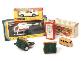 on y retrouve les marques : CORGI TOYS (MARCOS, couleur rare), BRITAINS (sans boîte) & MORESTONE (boîte non conforme) - on y joint une boîte vide de la marque BRIMTOY (état 'c') - les boîtes sont en états 'b' & 'c'