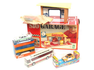 on y retrouve les marques : TEKNO (PAYS BAS), NZG, SCHUCO & NOREV (JET-CAR, manque un optique de phare) - on y joint un garage de la marque SIO (avec sachet d'accessoires non ouvert) - les boîtes sont en états 'b' à 'd'