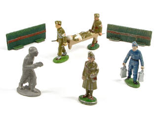 états de 'D' à 'R' - comprend : 2 brancardiers, un blessé allongé sur sa civière, une infirmière, un mécanicien de la RAF & un soldat américain en position de combat brut d'usine