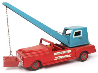 jouet à traîner réalisé en bois - avec godet amovible - longueur : 56 cm - petites parties vermoulues sur le pourtour des jantes - chaîne oxydée (enjoliveurs de roues plus ou moins) - quelques petites parties vermoulues avec légères craquelures de peinture par endroits