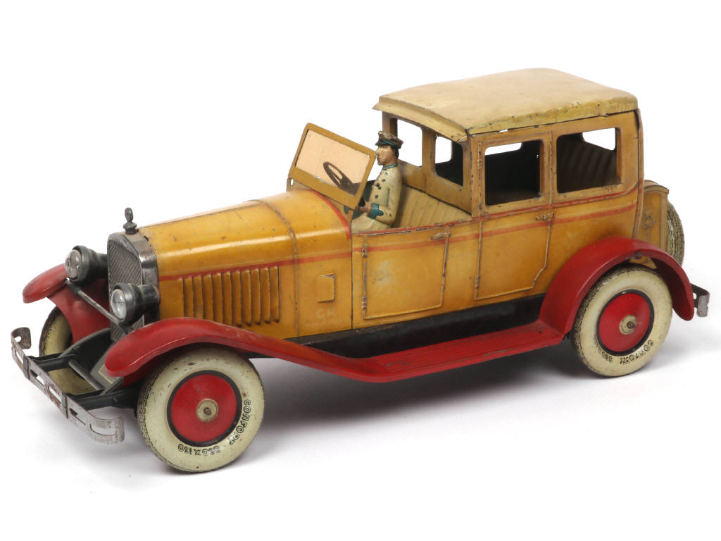 longueur : 38 cm - avec moteur à ressort (fonctionne), direction & phares électriques (une ampoule fonctionnelle) - carrosserie plus ou moins altérée & décolorée avec frottements - toit repeint - pare-chocs & d'autres accessoires plus ou moins brossés - plaque minéralogique arrière à repositionner (présente sous le châssis) - pare-brise amovible & maintien de pile non d'origine (possibilité de petits accessoires manquants) - manques de peinture sur les bandages de roues - bouchon de radiateur recollé