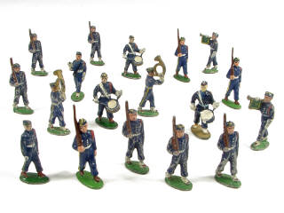 états de 'E' à 'R' - comprend : 9 soldats avec fusil à l'épaule, 3 tambours, 2 joueurs de cor, 2 clairons, un porte-étendard (manque étendard) & un soldat au défilé
