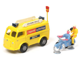 avec publicités 'L'EQUIPE - LE PARISIEN - KAS - PEUGEOT' - production récente sans plancher, avec étiquette de conformité collée sur l'intérieur de la carrosserie - balai présent - on y joint une moto du Tour de France avec 2 figurines non d'origine (quelques petits manques de peinture par endroits)