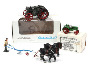 comprend : SUPER LANDINI & HEIDER 'D' - 16 (essieu avant cassé à recoller) - on y joint : un laboureur (de marque BRITAINS), une charrue & 2 chevaux de réalisation artisanale - on y retrouve les marques : AGRITEC & SPEC CAST