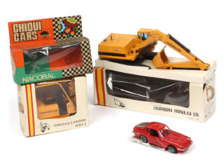 comprend : excavatrice sur chenilles, chariot élévateur & MASERATI coupé (jantes fondues - boite encrassée) - boites en états 'b' & 'c' - on y retrouve les marques : JOAL & NACORAL (série 'CHIQUICARS')