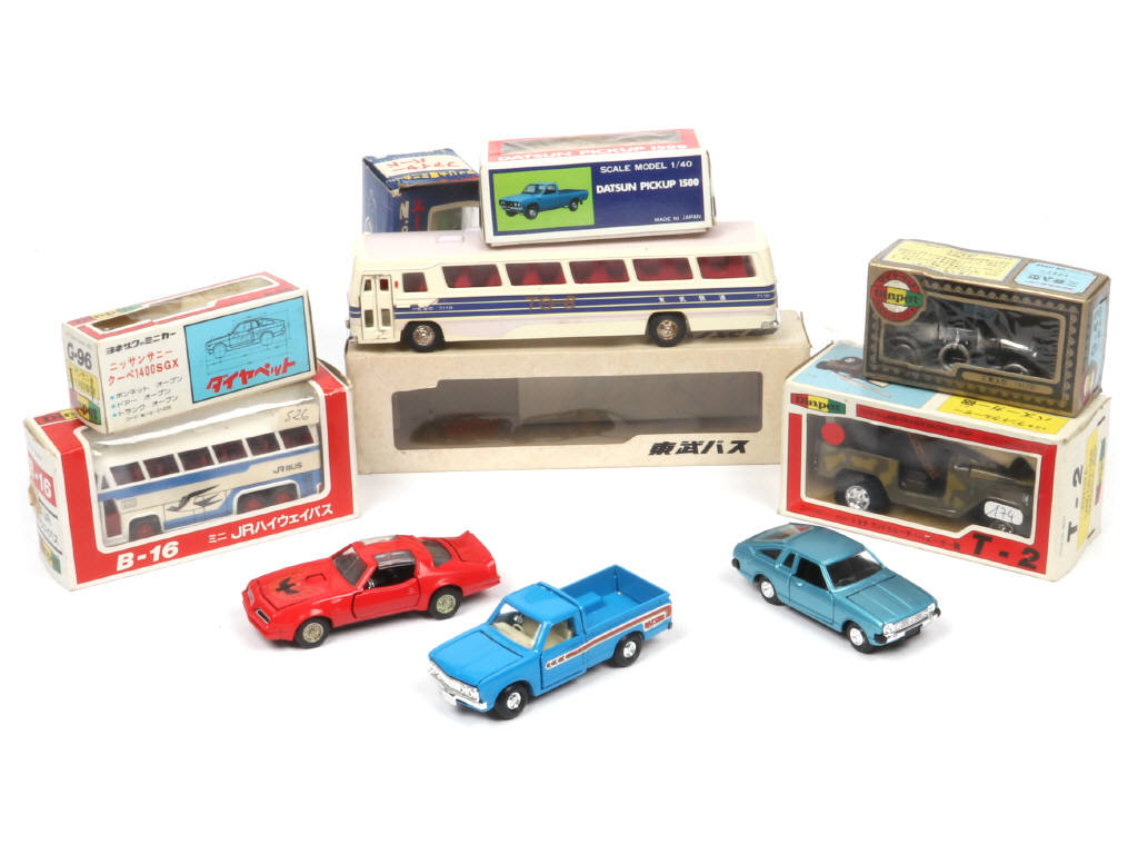 comprend notamment les modèles : MINI HIGHWAY bus, MITSUBISHI (une aile cassé - métal fatigue), TOYOTA, DATSUN, PONTIAC & NISSAN - on y retrouve notamment les marques : YONEZAWA TOYS DIAPET & K.K SAKURA - boites en états 'b' & 'c'