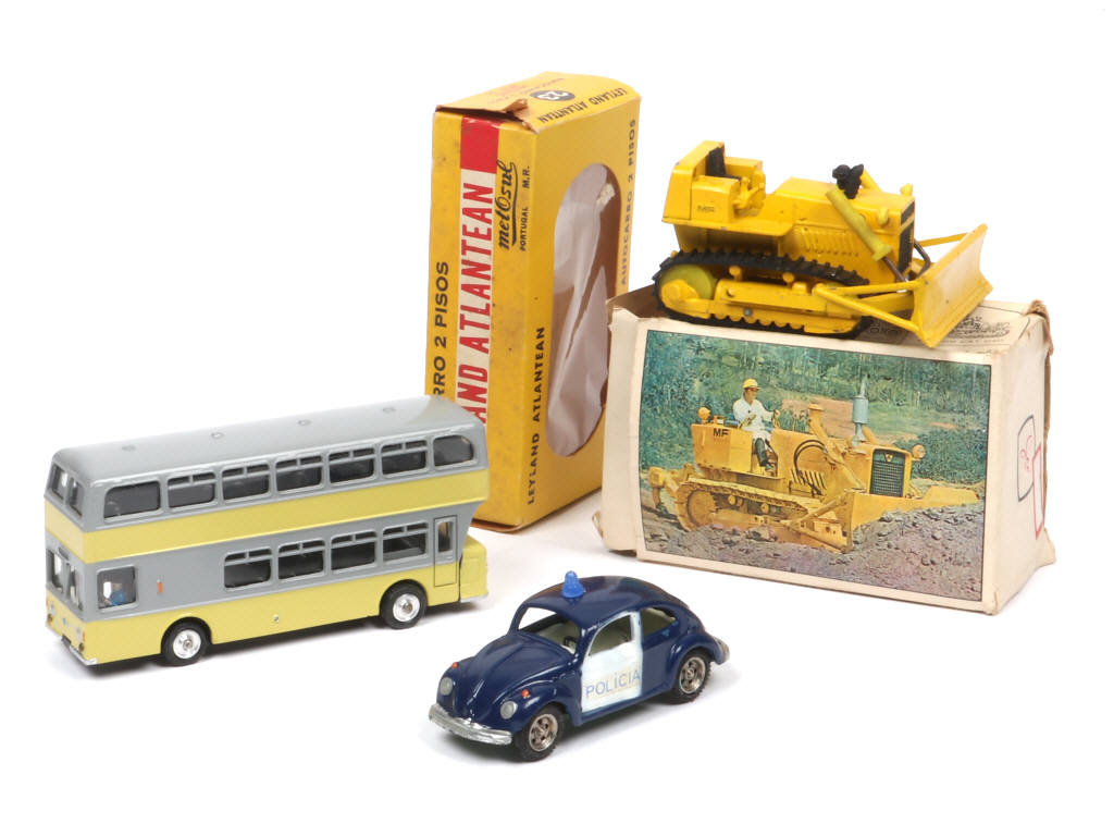 comprend : LEYLAND ATLANTEAN (boite en état 'c') & VOLKSWAGEN coccinelle 'POLICIA' (aménagement intérieur déformé) - pneus plus ou moins séchés - on y joint bulldozzer de la JUE en état 'C' avec manques & parties cassées (boite en état 'c')